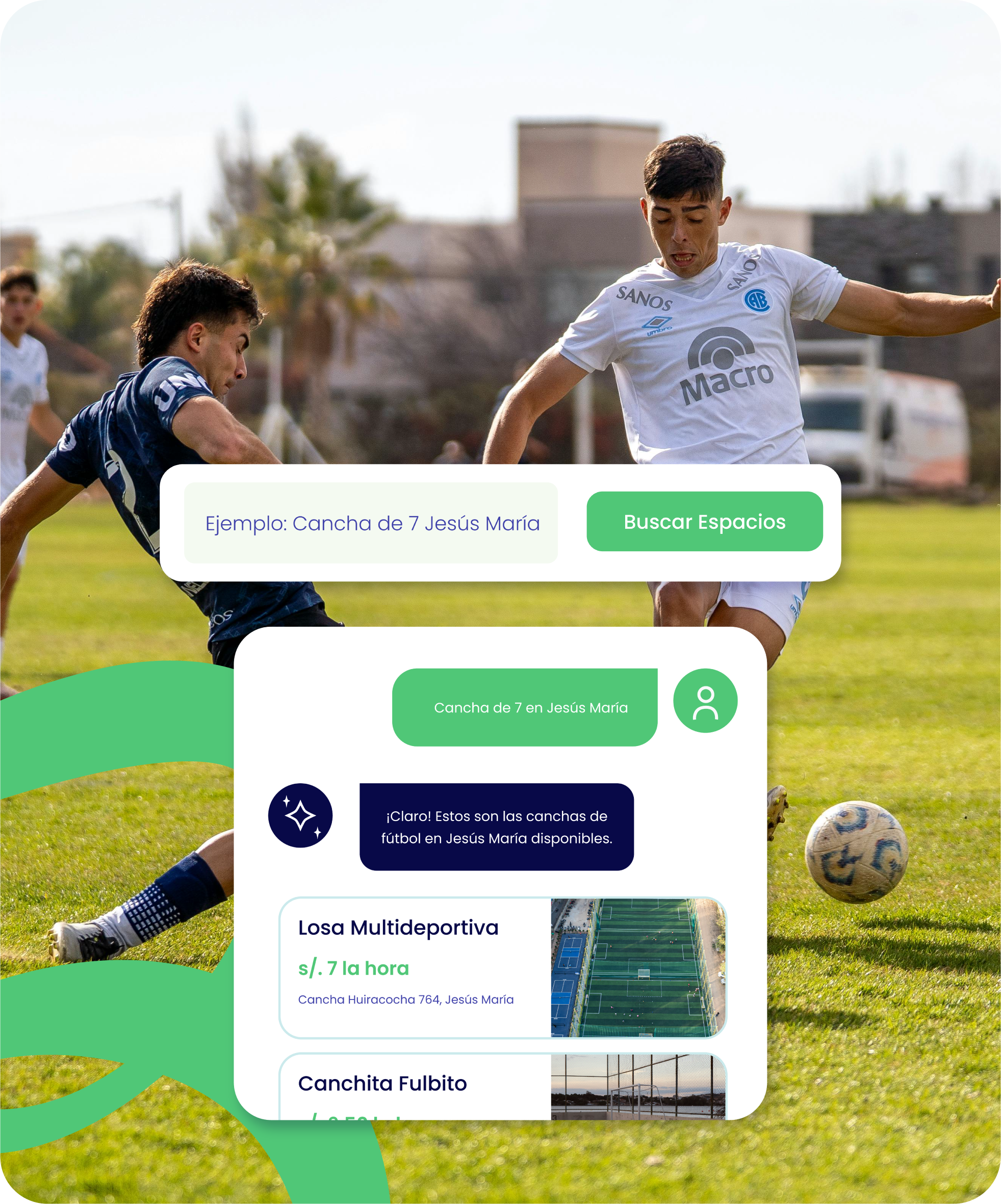 Encuentra y reserva canchas de fútbol, vóley, basket, tenis, pádel, salones de eventos y más espacios en Lima y todo el Perú. Búsqueda inteligente con IA, pago seguro y confirmación al instante.